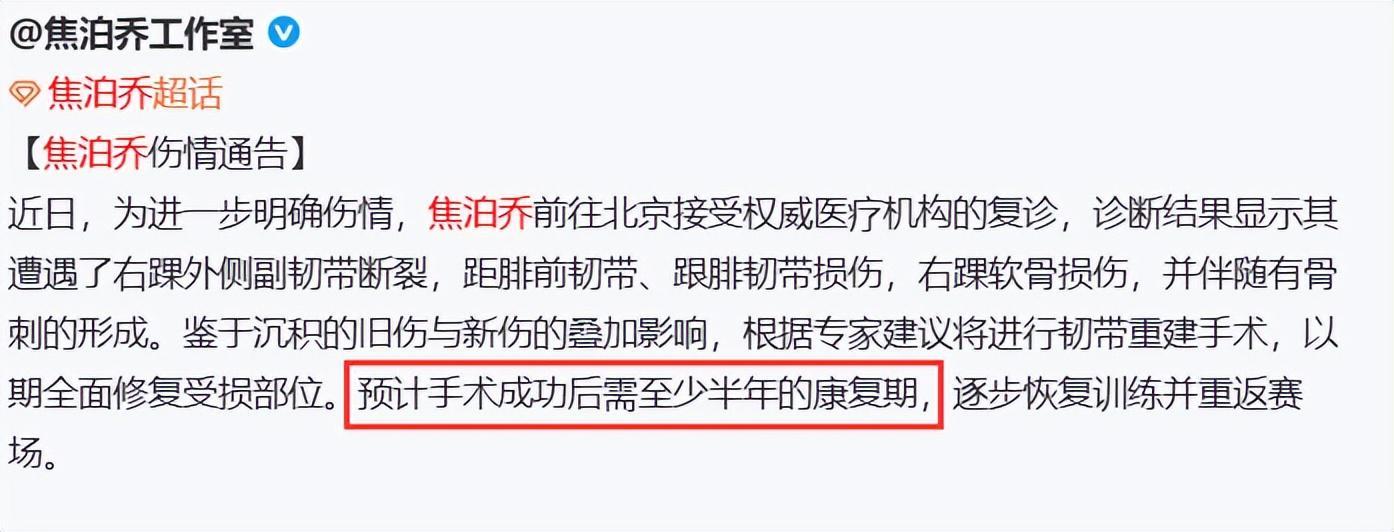 今年1月5日对阵青岛队时焦泊乔在比赛中受伤离场,据赛后焦泊乔的工作室声明,焦泊乔此次受伤的程度远超预期,外侧两根韧带断裂,必须手术取除膝盖后侧的韧带进行重建,同时磨除骨刺,修复因骨刺造成的软骨损伤。